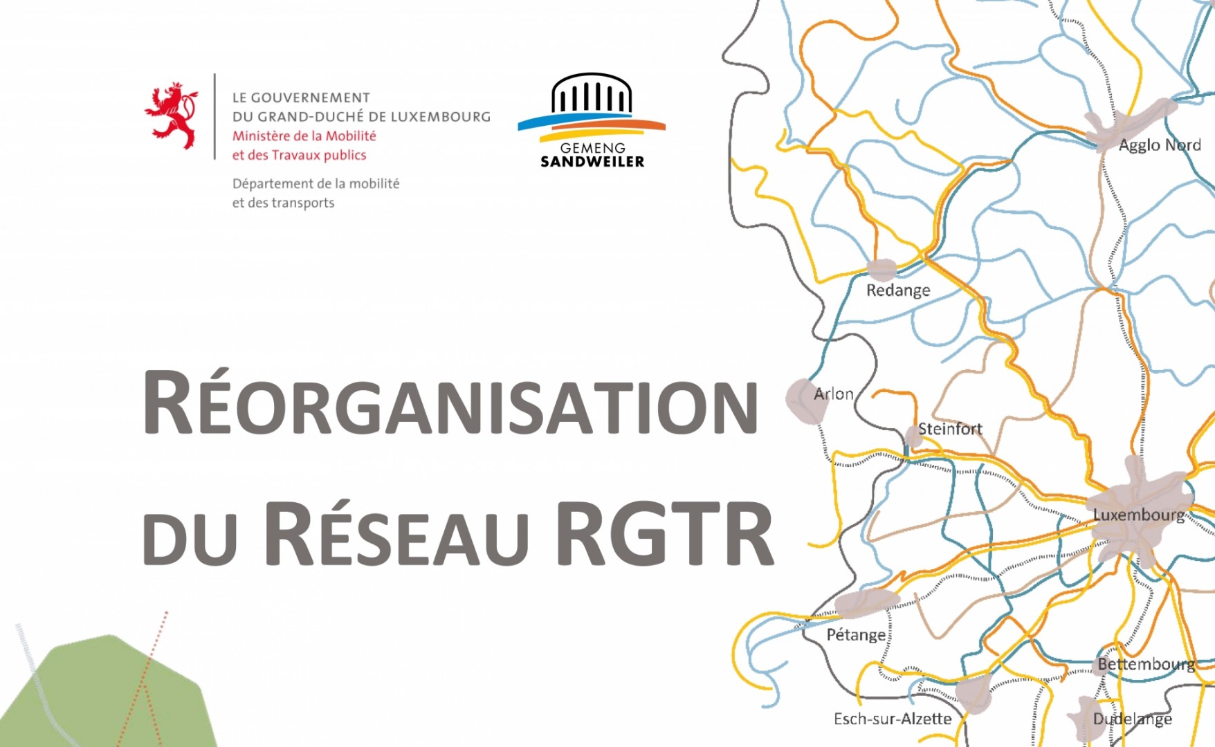 À cet effet, le collège échevinal en collaboration avec la Commission de l'Aménagement invite à une réunion d'information concernant la réorganisation du réseau RGTR, le 15 octobre à 19h30 au centre culturel à Sandweiler.