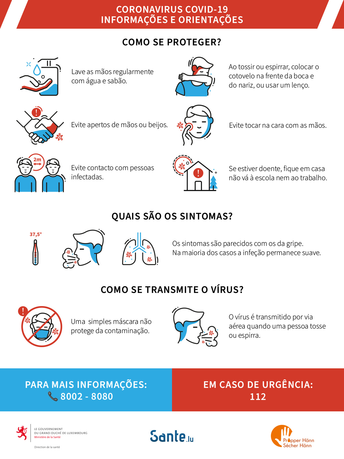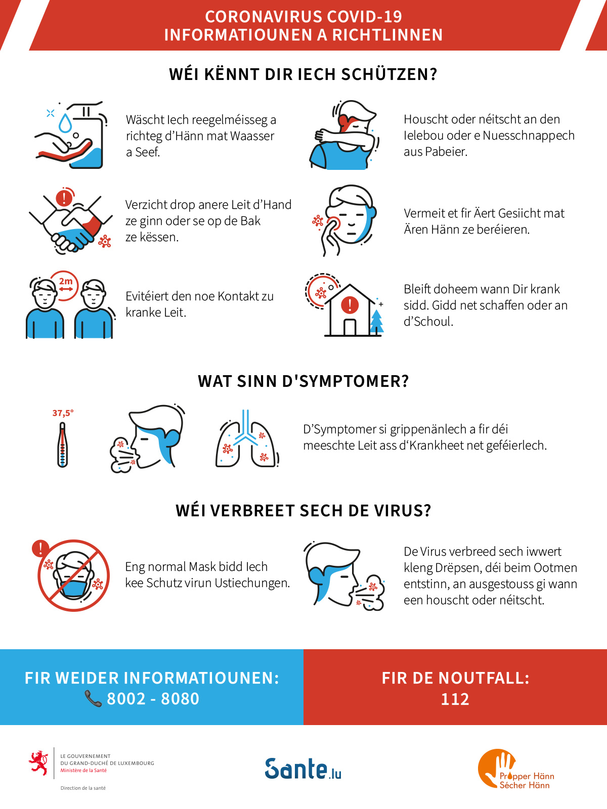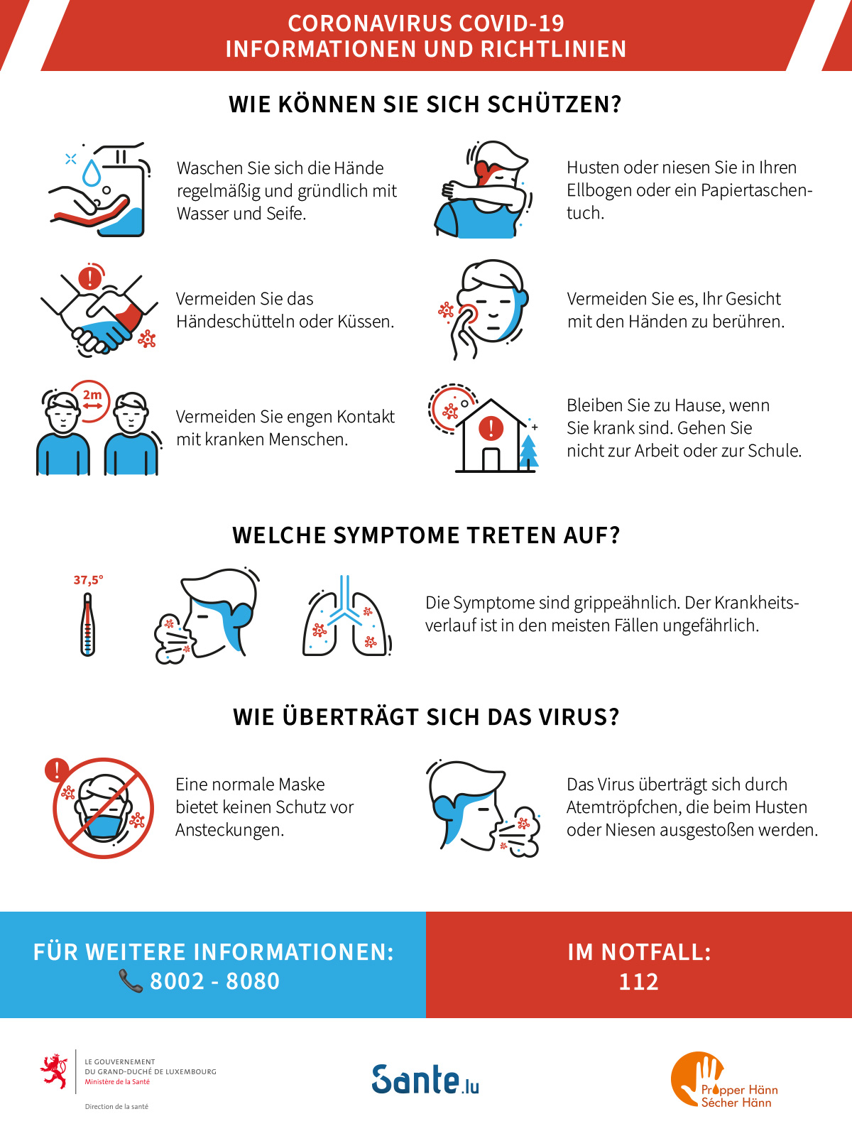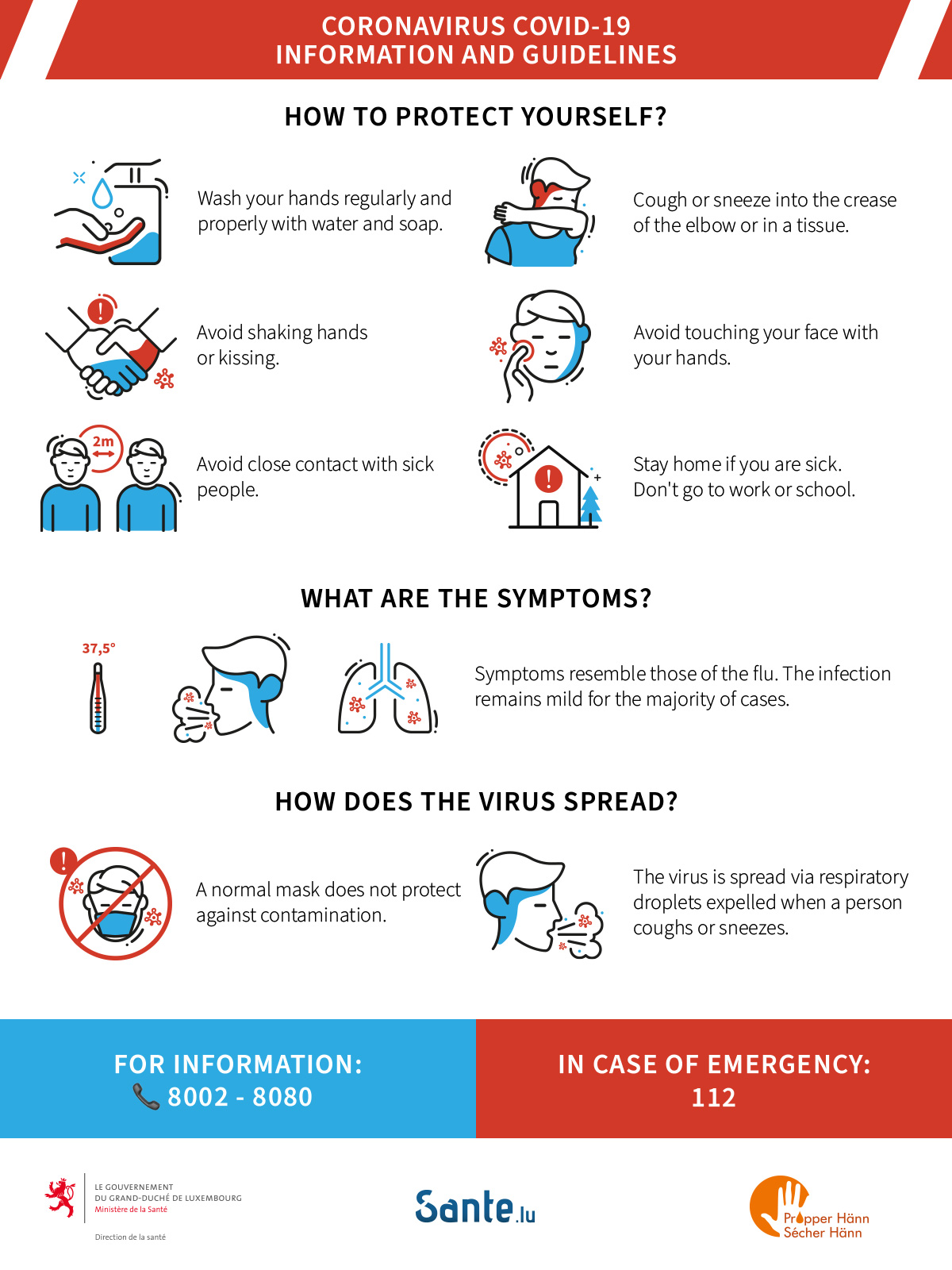 Dans le cadre des mesures prises par le gouvernement en réponse au risque d'épidémie du coronavirus au Luxembourg, veuillez trouver ci-dessous des informations, conseils et directives de la part du Ministère de la Santé.