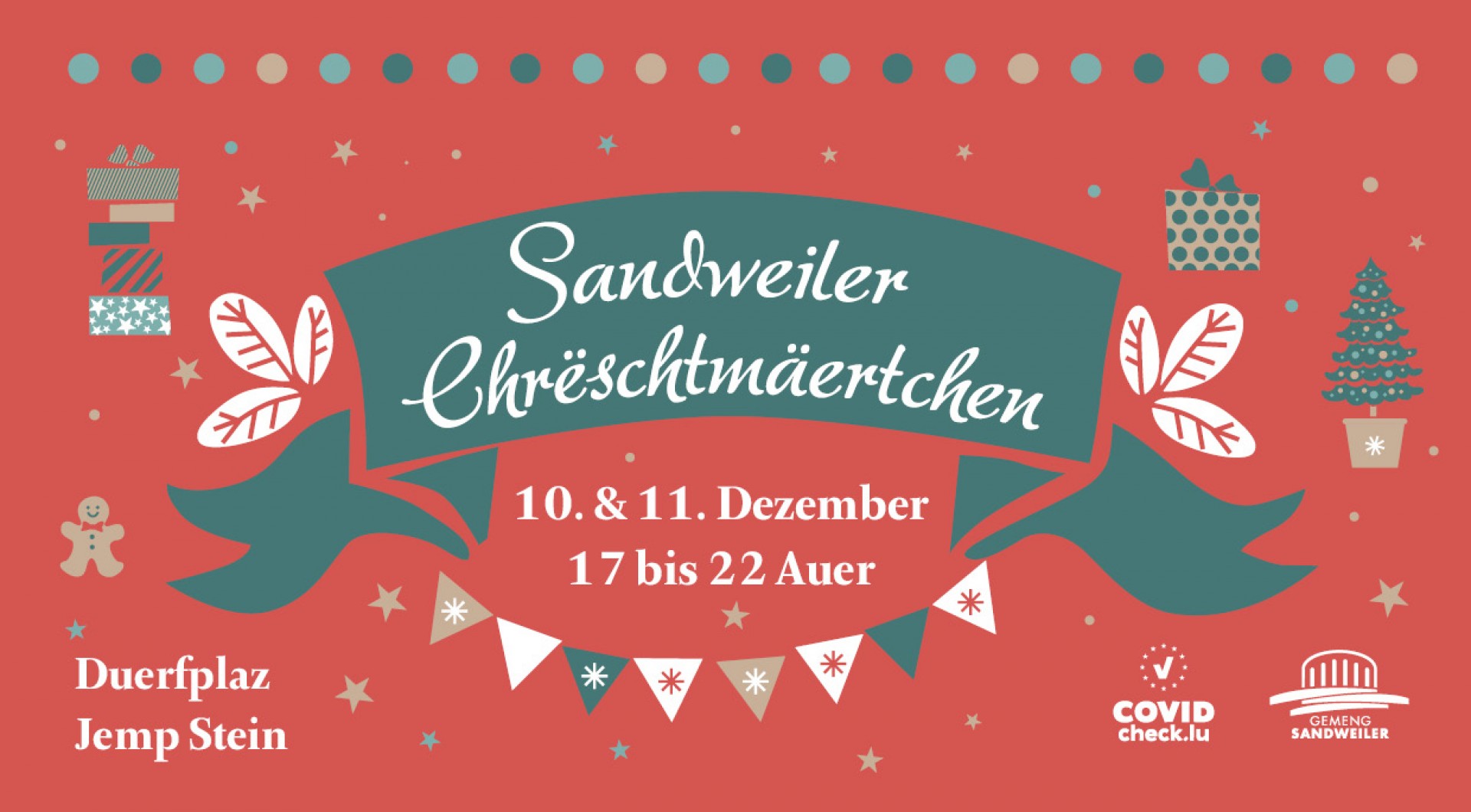 Le petit marché de Noël à Sandweiler aura bien lieu cette année ! Nous avons, avec le soutien des associations locales, mis en place un beau programme et nous nous réjouissons déjà de vous retrouver le vendredi 10 et le samedi 11 décembre de 17h à 22h sur la place du village.