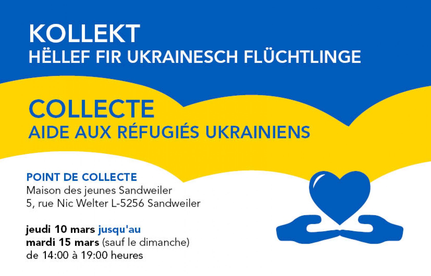 La commune de Sandweiler, en collaboration avec l'association « Lukraine » et la Maison des jeunes Sandweiler, lance une collecte pour aider les réfugiés ukrainiens.