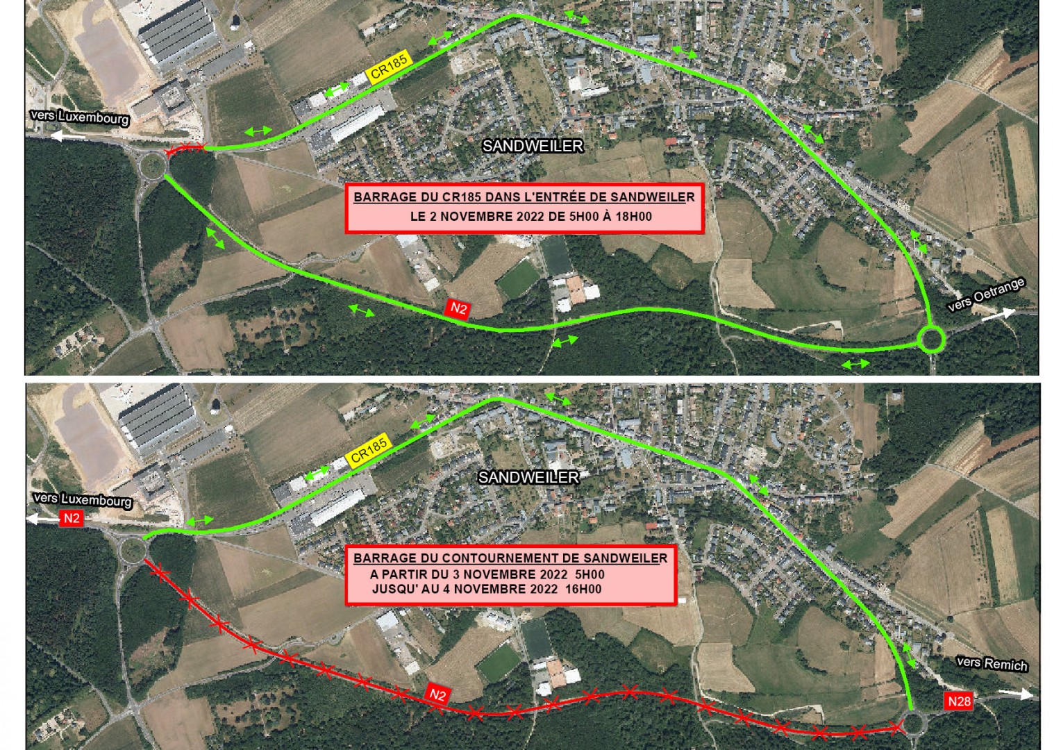 Le mercredi 2 novembre de 5 à 18 heures, la branche vers Sandweiler (CR185) sera barrée du giratoire jusqu'à la hauteur de l'entrée Cargolux à toute circulation. La déviation passera par le contournement de Sandweiler (N2).