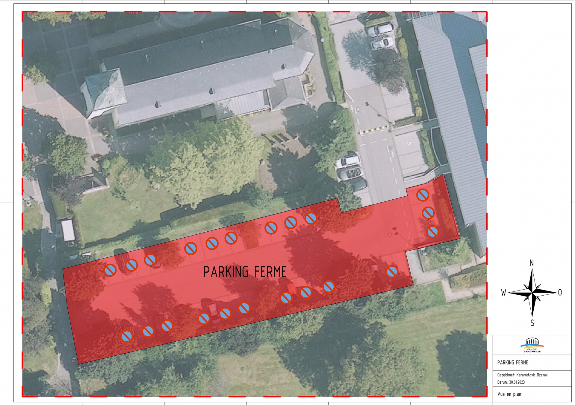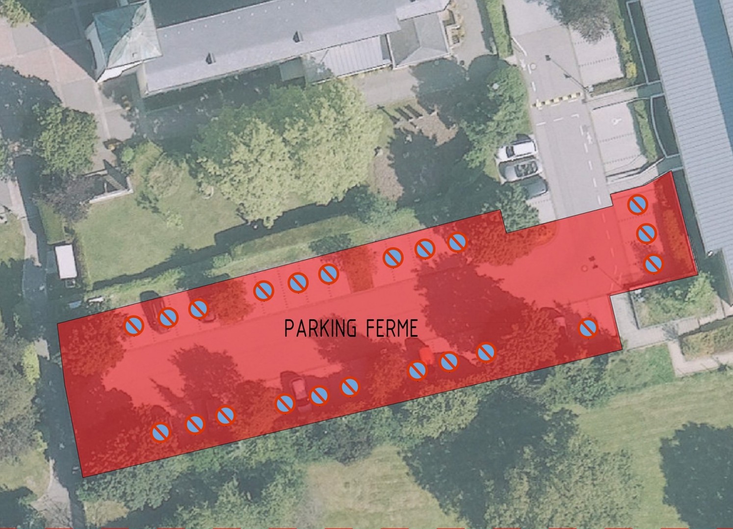 La plupart des emplacements (marqués en rouge sur le plan) du parking entre la commune et le centre culturel ne seront pas disponibles du 13 au 17 février inclus.