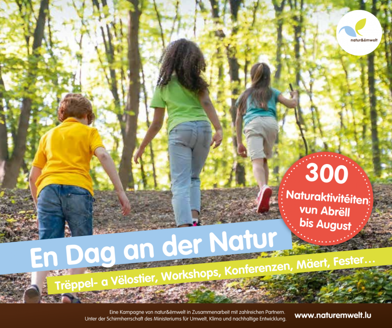 Entre le 1er avril et le 31 août 2023 Natur&Ëmwelt organise en collaboration avec ses partenaires la 26e édition de la campagne "En Dag an der Natur". L’objectif de la campagne est de réveiller l’intérêt d’un grand nombre de personnes pour la nature et de leur offrir la possibilité de connaître la beauté des paysages, de la faune et de la flore qui nous entoure.