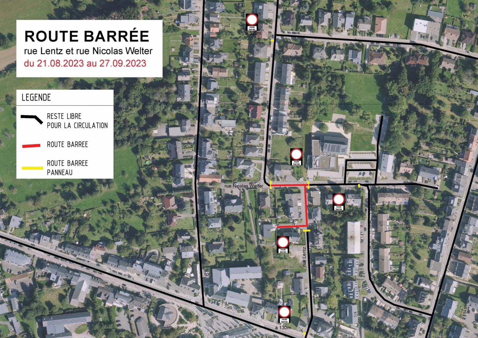En raison de travaux qui débuteront le 21.08.2023, nous vous informons que le tronçon allant du 10 rue Lentz au 12 rue Lentz et une partie de la rue Nicolas Welter à partir du numéro 1A, jusqu'au carrefour rue Lentz/rue Nicolas Welter seront fermés jusqu'au 27.09.2023.