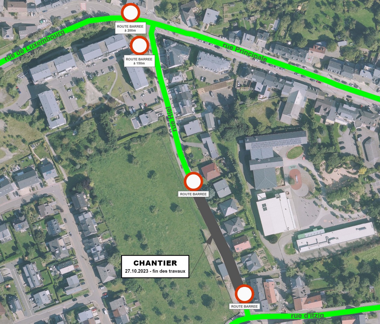 Dans le cadre du projet de réaménagement de la « rue Hiel » à Sandweiler, la rue sera barrée du n°17 au n°29A à partir du vendredi, 27 octobre 2023 8h00 jusqu'à la fin des travaux à cause de travaux sur un axe des eaux pluviales.