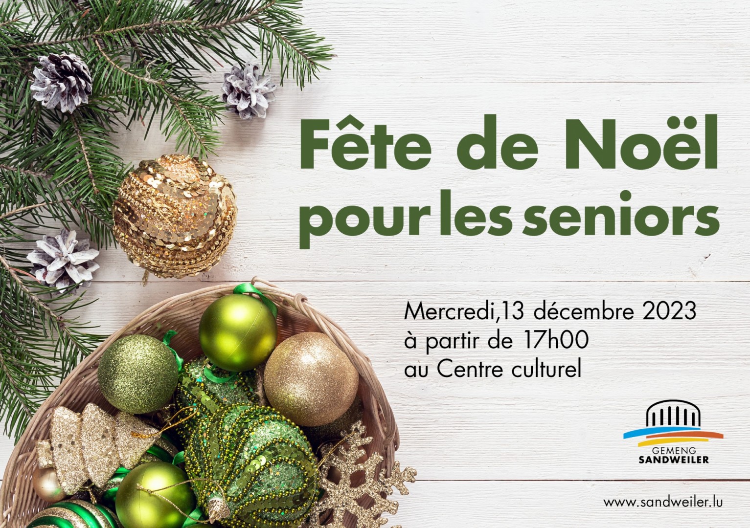 La commune de Sandweiler invite tous les seniors de Sandweiler (à partir de 60 ans) à une Fête de Noël qui aura lieu mercredi, 13 décembre 2023 à partir de 17h00 au Centre culturel.