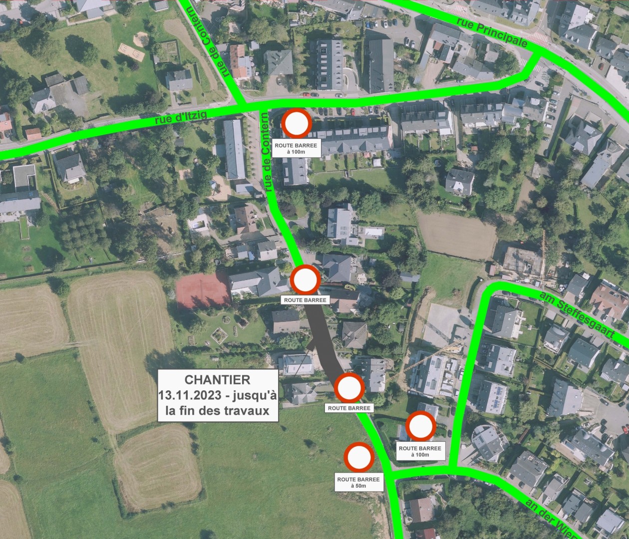 Dans le cadre du projet de réaménagement de la rue d’Itzig et pose de canalisation dans les rues d’Itzig, Contern et Hiel à Sandweiler, la "rue de Contern" sera barrée du N°8 au N°14 à partir du lundi, 13 novembre 2023 jusqu’à la fin des travaux suite à des travaux sur un axe des eaux pluviales.