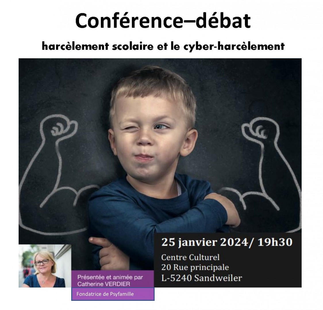 Les associations des parents d'élèves des écoles de Schuttrange et Sandweiler vous invitent à une conférence-débat sur le harcèlement scolaire, le jeudi 25 janvier 2024 à 19h30.