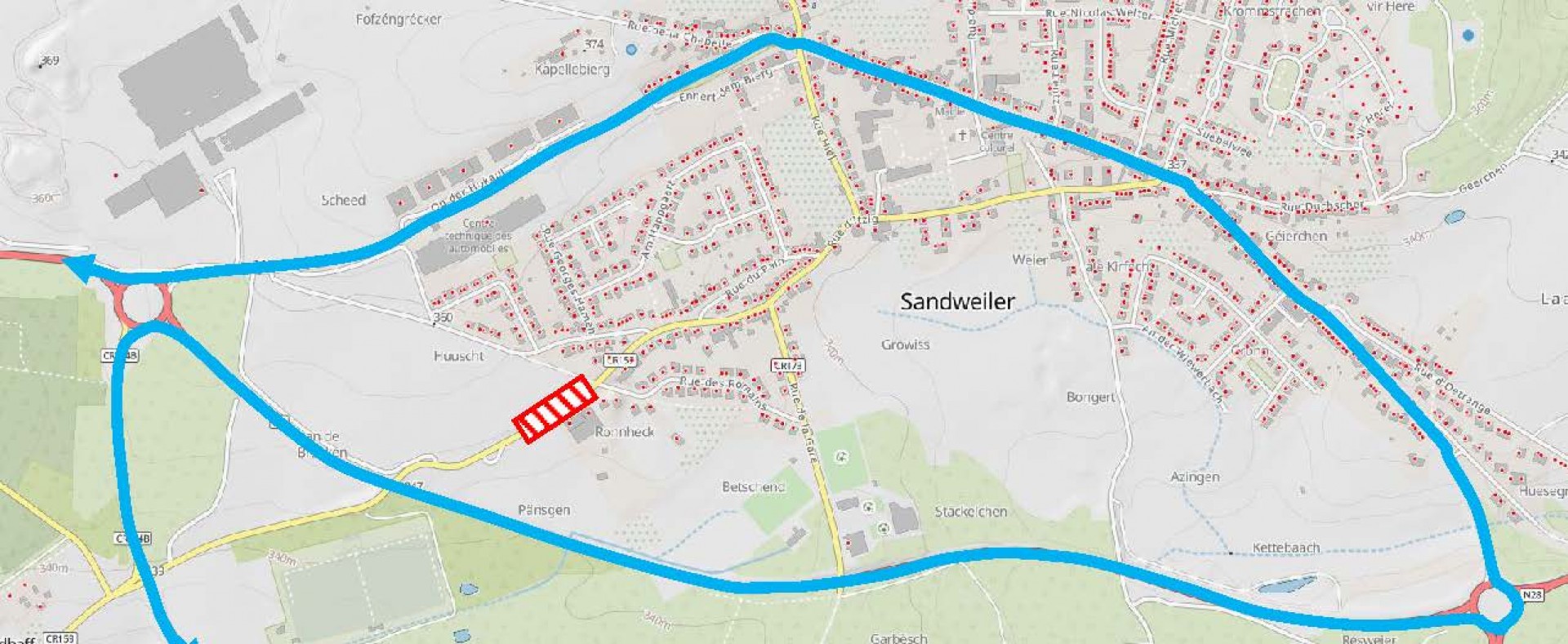Les courses d'autobus concernées en provenance de Contern circuleront via le C.R.234B – rond-point sortie N2 direction Remich - rond-point sortie Sandweiler – rue de Remich suite itinéraire normal et vice-versa. Ne seront pas desservis les arrêts de Sandweiler –Am Eck, -rue d’Itzig et –Apdikt.