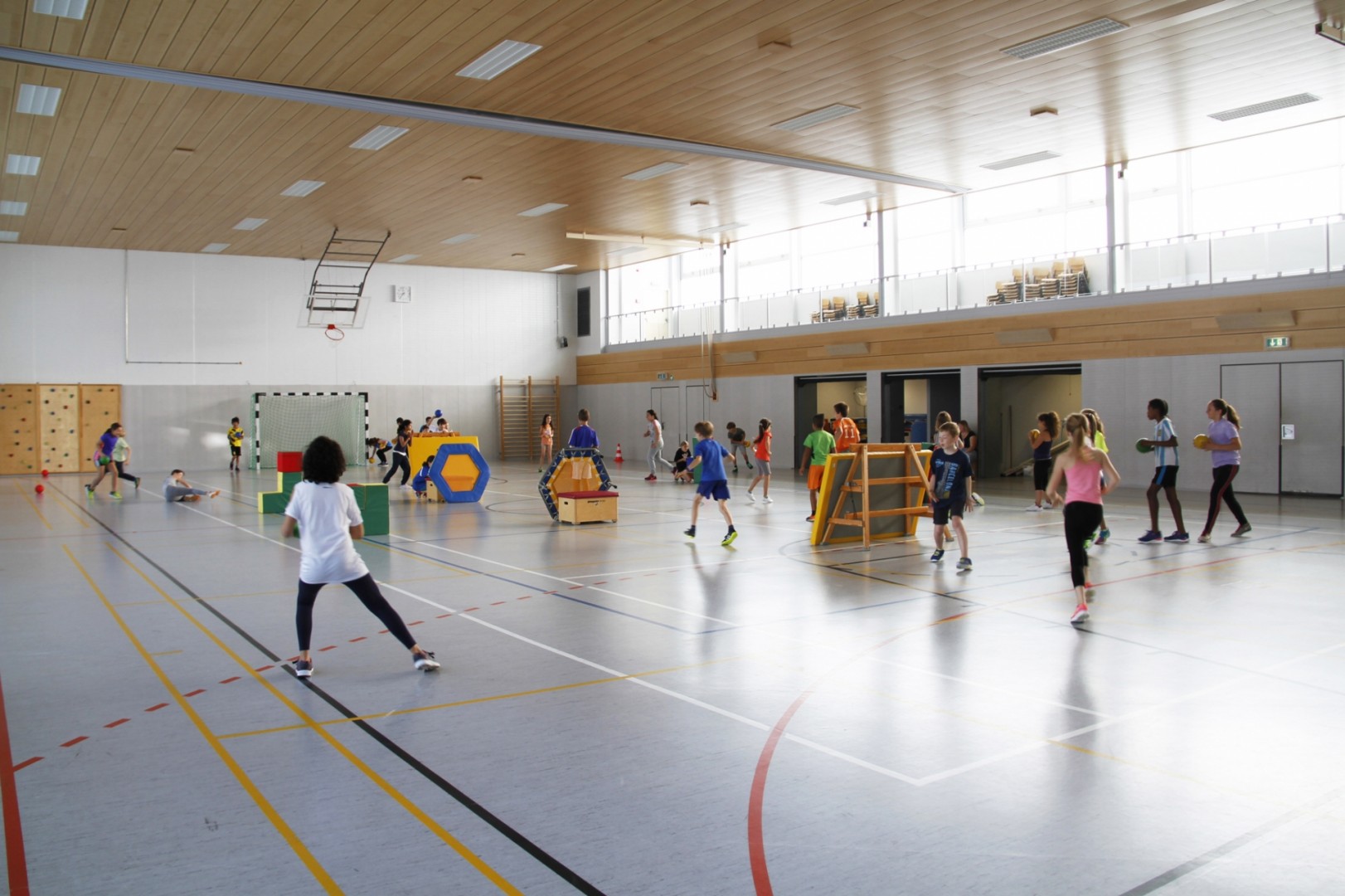 Avec une dimension de 33.05 m x 17.93 m, le hall sportif de Sandweiler est le lieu d'entraînement des associations locales ainsi que les enfants du bâtiment scolaire "Um Weier".